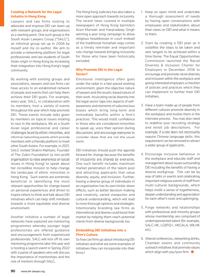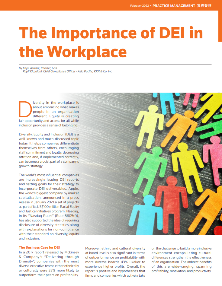 Kajal Aswani has co-authored an article on the importance of DEI in the Workplace for Hong Kong Lawyer magazine’s February 2022 issue. The article explores the business case for DEI, Kajal’s involvement in co-founding the South Asian Lawyers Group (SALG) in Hong Kong, and provides suggestions for how firms can incorporate DEI initiatives into a firm’s culture.