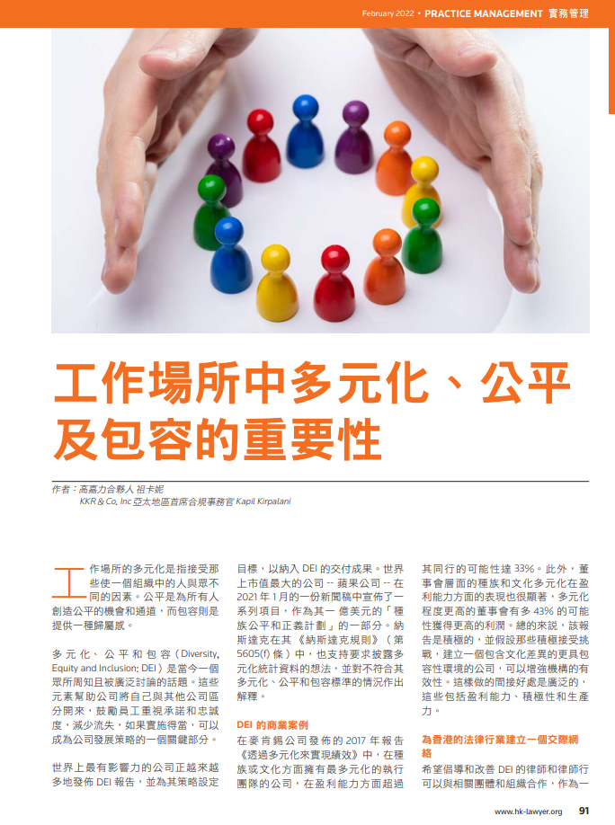 祖卡妮與香港律師共同撰寫關於多元化、公平和包容(“DEI”)在工作場所的重要性的文章
