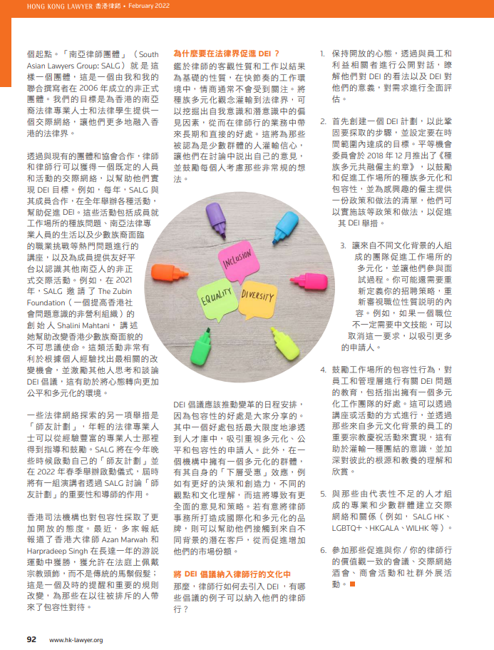 祖卡妮為香港律師2022年2月的雜誌共同撰寫了一篇關於多元化、公平和包容(“DEI”)在工作場所的重要性的文章。這篇文章探討了DEI 的商業案例,由祖卡妮在香港共同創立的香港南亞律師協會 (SALG)的目標,並就公司如何將 DEI 舉措融入公司文化提供了建議。